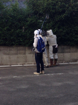 次の作業は、近所の子ども達が見つけた、生垣の中にあったスズメバチの巣の駆除です。