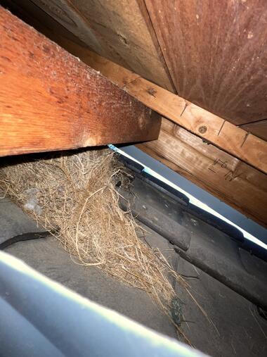大きなお寺様からのご連絡で調査に伺うと、天井裏には屋根の隙間から大量の藁が運び込まれていました。