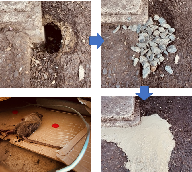 2022年02月22日(火) ネズミ ネズミ駆除と侵入口閉鎖 ネズミ駆除を行わせていただきました。 駆除しても、ネズミの生息数は多いので侵入口を塞がないとまた他のネズミが侵入してしまいます。 外部の穴は砂利を埋めてコンクリートで固めて再侵入を防ぎます。 侵入していたネズミも捕獲したので、1年間は無料保証で再発したら無料で再施工させていただきます。